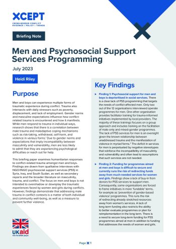This Briefing Note explores humanitarian responses to conflict-related trauma amongst men and boys, and finds that addressing male trauma supports individual and community well-being, as well as helping to prevent further violence.